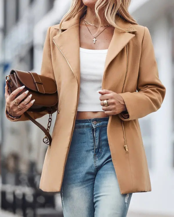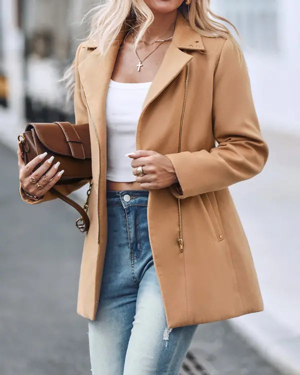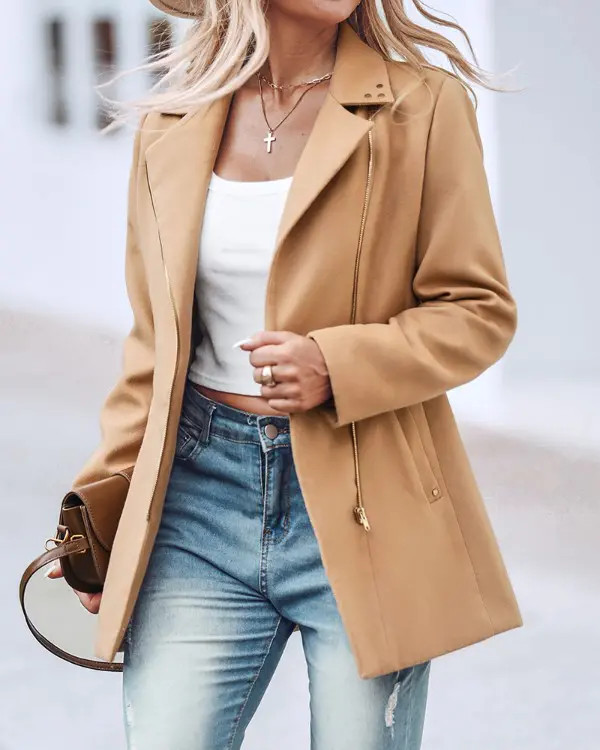 Notched Collar Studded Zipper Closure Pocket Design Coat